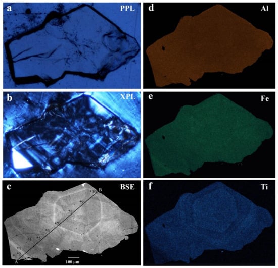 Images for sample-6 from Aosta, Italy. Thin-section images are in (a) plane-polarized light (PPL) and (b) cross-polarized light (XPL) that shows birefringence. (c) The BSE image contains light and dark contrasts that indicate different compositions. The X-ray elemental maps show the distribution of (d) Al, (e) Fe, and (f) Ti atoms. Chemical analyses were obtained from the points marked 1 to 10 in (c). Concentric growth features are observed in the BSE image and in the atom distribution maps. Subtle compositional differences are observed. The BSE image, elemental maps, and optical images have the same orientation and scale. The scale bar in (c) represents 100 μm.
