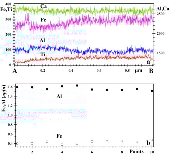 (a) Line scans along the line A to B in Figure 9c showing the inverse relation between Fe3+ and Al3+ cations, homogeneous Ca, and variable Ti distributions. The scans indicate Fe-poor and Fe-rich phases. (b) Quantitative chemical analyses from points 1 to 10 showing the inverse relation between Al and Fe atoms in the Y site (Figure 9c; Table 1). Note that Fe + Al = 2 apfu. The line scan units are arbitrary.
