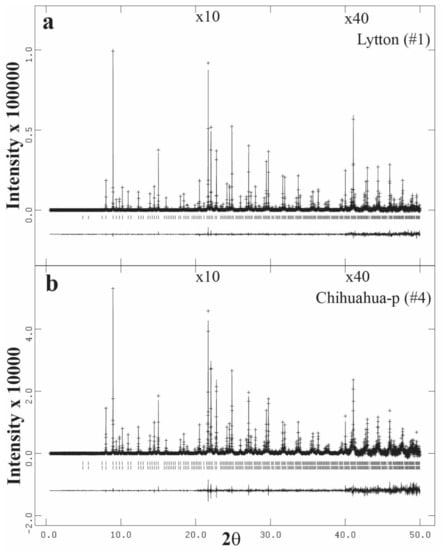 Complete HRPXRD traces for (a) sample-1 from Lytton, Canada, and (b) sample-4 from Chihuahua-p, Mexico. Data for sample-4 were modelled using two slightly different cubic phases, whereas sample-1 was modelled with a single cubic phase. The difference curve (Iobs − Icalc) is shown at the bottom. Short vertical lines indicate allowed reflection positions. The intensities and difference curves that are above 20° and 40° 2θ are multiplied by 10 and 40, respectively. Similar features are displayed in other traces shown. To avoid repetition, these descriptions will not be repeated.