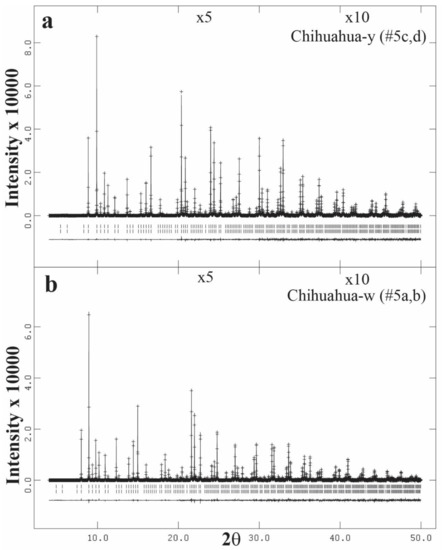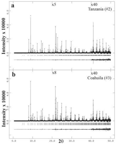 - Antao, S.M.; Hassan, I.; Wang, J.; Lee, P.L.; Toby, B.H. State-of-the-art high-resolution powder X-ray diffraction (HRPXRD) illustrated with Rietveld structure refinement of quartz, sodalite, tremolite, and meionite. Can. Mineral. 2008, 46, 1501–1509. [Google Scholar] [CrossRef]
