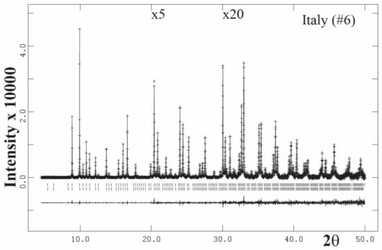 The samples were studied with HRPXRD that was performed at beamline 11-BM, Advanced Photon Source (APS), Argonne National Laboratory (ANL). A small fragment (about 2 mm in diameter) of the sample was crushed to a fine powder using a corundum mortar and pestle. The crushed sample was loaded into a Kapton capillary (0.8 mm internal diameter) and rotated during the experiment at a rate of 90 rotations per second. The data were collected at 23 °C to a maximum 2θ of about 50 with a step size of 0.001 and a step time of 0.1 s per step. The HRPXRD traces were collected with a multianalyzer detection assembly consisting of twelve independent silicon (111) crystal analyzers and LaCl3 scintillation detectors that reduce the angular range to be scanned and allow for rapid acquisition of data. An external silicon (NIST 640c) and alumina (NIST 676a) standard (mixed in a ratio of ⅓ Si:⅔ Al2O3 by weight) was used to calibrate the instrument and refine the monochromatic wavelength used in the experiment (see Table 2). Additional details of the experimental set-up are given elsewhere [46,47,48]. The experimental techniques used in this study are well established [49,50,51,52,53,54,55,56,57,58,59].