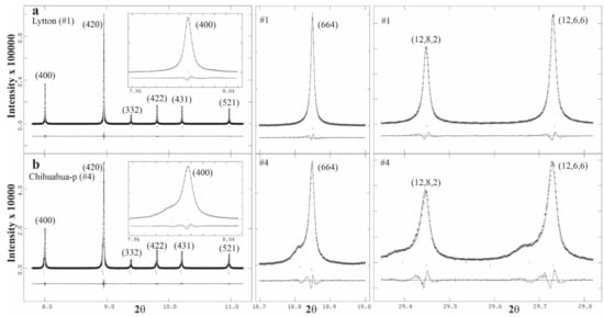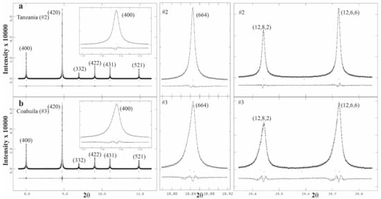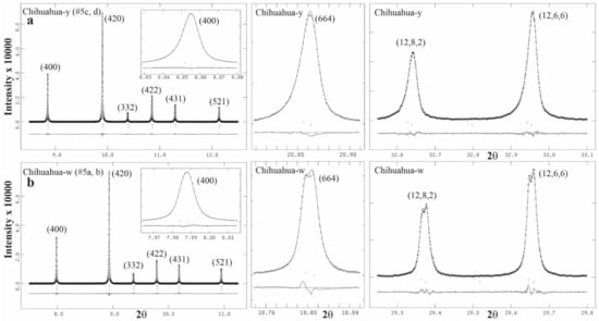 The same reflections are displayed for the two-phase samples from (a) Chihuahua-y, Mexico (sample-5) and (b) Chihuahua-w, Mexico (sample-5). Each reflection peak in (a) is asymmetric because of two different cubic phases, whereas those in (b) show clear splitting from the two phases.