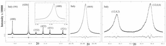 Sample-2 from Tanzania contains a single cubic phase with sharp, symmetric, and narrow peaks with no splitting of reflections (Figure 16a). The two phases in sample-3 are evident from the asymmetry in peaks (Figure 16b).