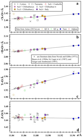 The <D-O> distances (<D-O> = {(Z-O) + (Y-O) + (X-O) + (X’-O)}/4) vary linearly with the a unit-cell parameter, as was previously pointed out by Antao and Klincker ([6]; Figure 19b). All the data points shown in Figure 19b essentially fall on the straight line for <D-O>, but the other distances (Z-O, <X-O>, and Y-O) show some scatter (Figure 19a,c,d). Satisfactory coordination of the O atom appears to be most important for the garnet structure.