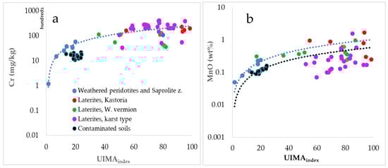 The best pronounced relationship between the UIMA index and Fe, Cr, Mn, and Co, which are characteristic components of ophiolites, is that with Cr (Figure 1a) and MnO (Figure 1b), especially for weathered peridotites and saprolite zones.