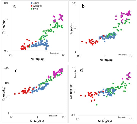 Variation of (a) Cr, (b) Fe, (c) Co, and (d) Mn versus Ni contents in soils from the Assopos–Thiva basins, C. Evia., and, in laterite deposits. Data from [50,60,61,62,63].