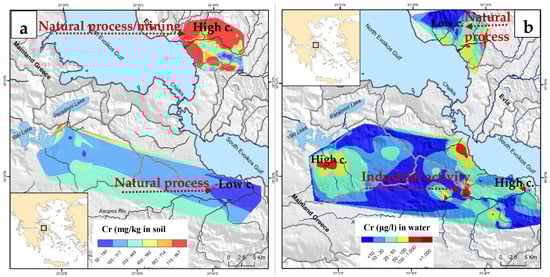 Maps showing spatial distribution of Cr in soils due to natural processes and mining of Fe-Ni laterites (a), and in groundwater from the Evia and Assopos–Thiva basins due to natural processes, mining, and industrial activity (b) [30].