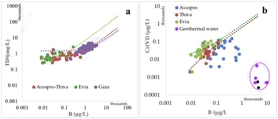 Plots of the Cr(VI) and total dissolved solids (TDS) versus B concentrations (a,b) for coastal groundwater from C. Evia, Assopos, and Thiva basins, seawater, and geothermal water. Data from [25,64,65,82,83,84].