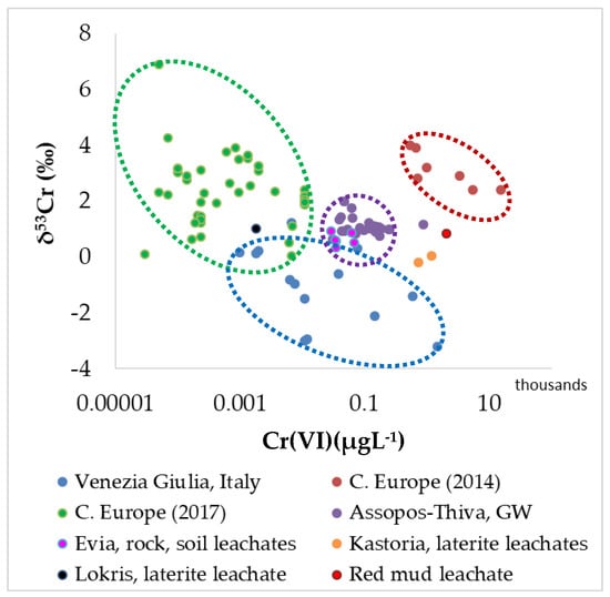 Plot of the δ53Cr values versus Cr(VI) in contaminated by Cr(VI) groundwater by industrial activities in the Friuli Venezia Giulia (Italy), the Czech Republic (Central Europe), the Assopos, Thiva basin affected by both industrial activities and natural processes, and Central Evia of geogenic origin. Data from [82,132,138,139,140].