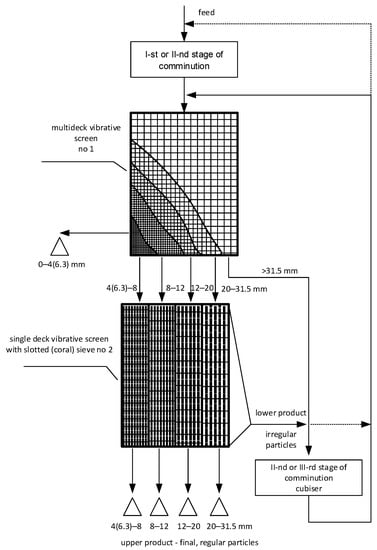 The circuit designed according to the innovative idea, can produce a final aggregate product with irregular particle contents as low as 2–3%. It requires only the application of quadratic and slotted mesh sieves, cooperating with the crusher working in a closed circuit, either operating on a first or second stage. The obtained irregular particles can be comminuted in the same crusher or in a secondary stage of crushing, for example in an impact crusher (cubiser) what can additionally improve the quality of the product. The contents of irregular particles in final products depends on capacity of the screen with slotted sieve and especially on the relation between the narrow particle fraction range and size of the slot in sieve. This sieve should be selected according to “dmax/2” principle, i.e., half of the maximum size of the particle fraction. For the reason that content of irregular particles is lower for coarser particle fractions and the screening efficiency for coarser particles is better, screening of irregular particles in coarser fractions will be easier and more efficient.