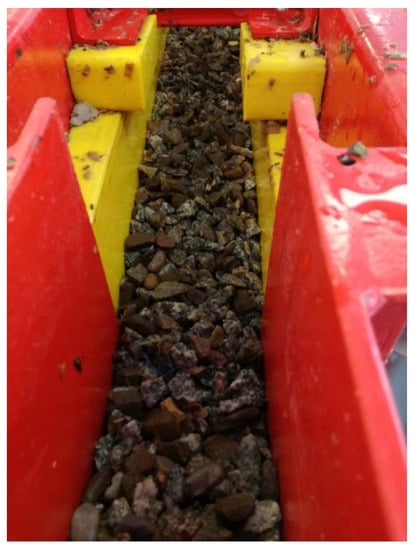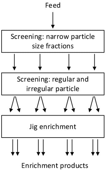 Jig beneficiation is most commonly used for coal preparation, where the difference in densities of coal and the waste rock are high [7,8]. In rock materials processing, the effectiveness of separation process might be lower, but it greatly depends on the degree of useful mineral liberation and the difference in densities of the material being separated. However it appears that apart from density several other features of the feed material are influential, like particle size and the shape of individual particles [9,10]. Results of various investigation show that after suitable preparation of the feed material i.e., separation of entire feed into narrow particle size fractions, together with distinction of regular and irregular particles, may significantly increase the effect of jig process beneficiation. The jig enrichment technology can also be used in the processing of other mineral resources, especially in removing of impurities at initial stages of aggregates, sand or gravel treatment [11]. It is also possible to recover in jigs building materials from demolition debris and road materials [12], electronic waste or plastic [13,14].