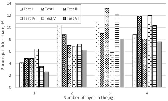 Calculated averaged values of absorbability and density are presented in Table 6. Inspecting the table it can be seen that there is little difference between the values for irregular and regular products (tests I and II) when the material has a natural particle size composition. However, for material with a narrow particle size range (tests III and IV) the absorbability is much greater in material consisting of irregular particles than it is in material consisting of regular particles. This indicates that the application of the patented solution for improving the quality of beneficiated material—by splitting the feed into narrow size classes—is justified. No significant improvement in variation of density was observed. Summary of percentage contents of porous particles in each layer of enrichment were presented in Figure 5.