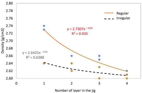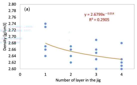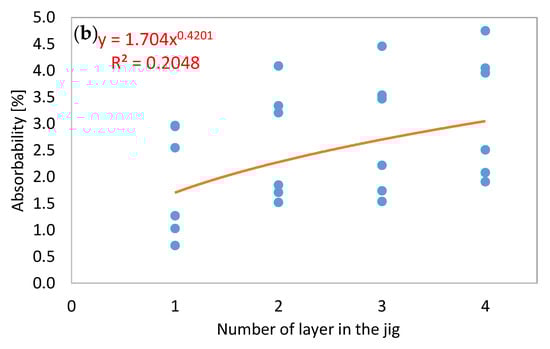 Modeling results show that relationships between the number of separation product and its selected feature is in correlation, to some extent. Relationships between density/absorbability and number of the separation product (specific layer in the jig) do not show significant correlation for the entire set of data. There can be observed hyperbolic relationship, indeed, but statistical significance of this model is rather low (Figure 6).