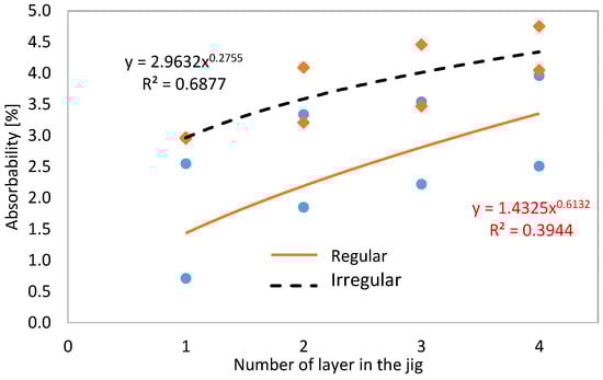 More precise modeling results can be obtained when enrichment products obtained from regular and irregular feed material will be analyzed separately. Results for density was presented in Figure 7, while models for absorbability in Figure 8. Relationship between density and number of enrichment product for regular particles shows high level of accuracy (R2 = 0.935) and is statistically significant. Lower statistical significance shows model for irregular particles but it is also significant on the probability level 95%. In the case of absorbability (Figure 6b) the model is statistically significant only for irregular particles. However both models show the similar type of relationship. Tendency in density decreasing together with increasing the number of layer describes well a hyperbola, while absorbability can be characterized through exponential model, with the power at x less than one.