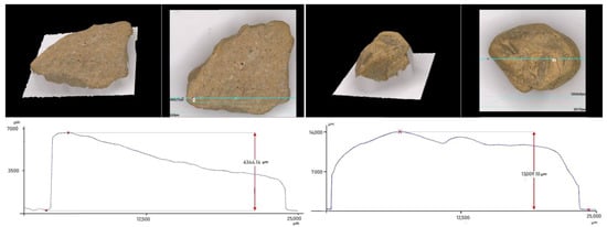 Shape investigations of separation products were carried out by means of 3D Keyence VHX-7000 microscope. The figures map the profiles of the projection surface (base of particle) in space after transformation of an image into 3D by the computer (Figure 10). A particle is considered irregular if a profile of the length of its base is three times larger than the profile of its width or height. The analysis proves that more flat particles accumulate in the top layer.