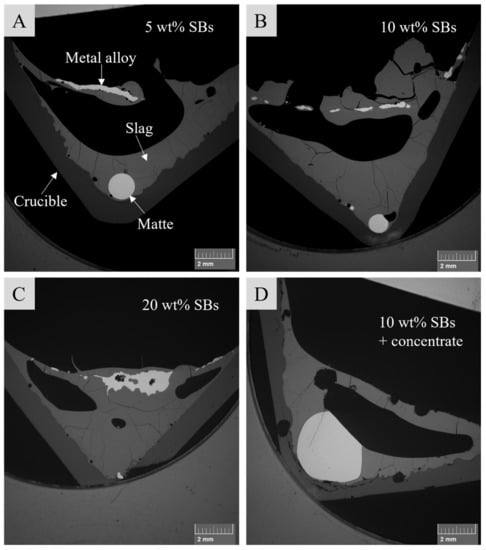In all samples with 5 wt.% of SBs in the starting mixture, the presence of slag, metal alloy, and matte was observed, as presented in Figure 2. In the samples with 10 wt.% of SBs, the same phases were found in all samples except the sample after 2 min contact time, where the matte phase could not be located in the existing cross-section.