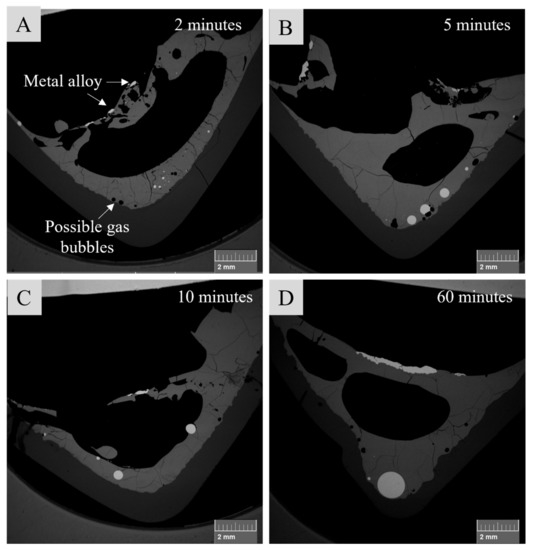Figure 2 shows microstructures of the samples with 5 wt.% SBs in the starting mixture after 2, 5, 10, and 60 min contact times. After 2 min contact time, small matte droplets were found in the lower part of the slag, and small areas with metal alloy were discovered on top of the slag. After 5 and 10 min contact times, the formed matte phase coalesced into larger droplets. As shown in Figure 1, after 40 min contact time, a bigger matte phase was found on the bottom of the slag similarly to the sample after 60 min contact time. Moreover, the size of the metal alloy phase in the samples seemed to increase along with contact time; however, no definitive conclusions can be drawn regarding the amount of metal alloy on the basis of one sample cross-section only.