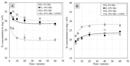 Fe and Si are the major elements in the slag, and their concentrations are presented in Figure 4A,B. Iron concentrations in the starting mixtures were around 34, 32, and 29 wt.% with 5, 10, and 20 wt.% of SBs, and the iron concentration in slag decreased significantly during the first 20 min of reduction. After 60 min contact time, iron concentration in the slag reached around 28 wt.% for the systems with 5 wt.% and 10 wt.% of SBs, and around 20 wt.% for the system with 20 wt.% of SBs. Contrary to iron, silicon concentration in the slag increased with longer contact time. Similarly to the case of iron concentration, the most significant change in Si concentration occurred during the first 20 min. The reason for the increase in Si concentration was the reduction of iron oxide and other metal oxides, as well as the dissolution of silica from the crucibles used in the experiments.