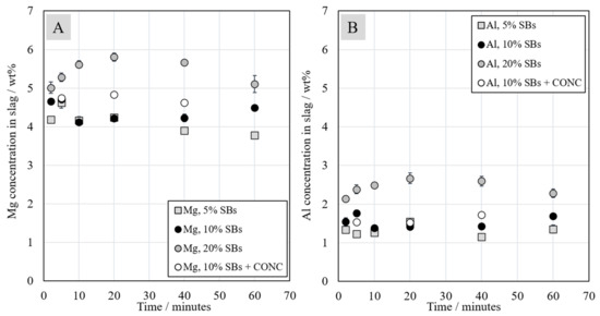 Magnesium and aluminum concentrations in the slags are presented in Figure 5. Their concentrations did not significantly change when the reduction proceeded, as MgO and Al2O3 are very stable oxides and do not deport in the matte or alloy phases in the experimental conditions. In the systems with 5 wt.% and 10 wt.% of SBs, Mg concentrations were quite similar and varied between 3.8 wt.% and 4.6 wt.%. The addition of Ni-concentrate slightly increased the concentration of magnesium in the slag. For the system with 20 wt.% of SBs, the concentration values were between 5 wt.% and 6 wt.%.