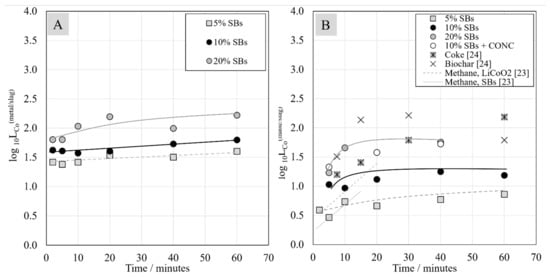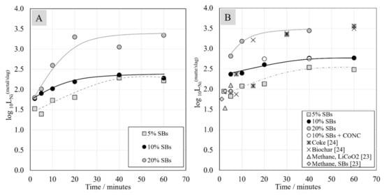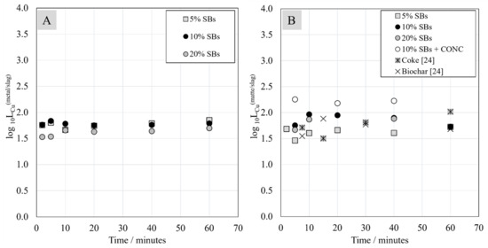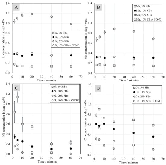 In the current study, concentrations of lithium and manganese in the slag, presented in Figure 6A,B, seemed to be relatively constant as a function of time in the systems with 5 wt.% and 10 wt.% of SBs. The addition of Ni-concentrate did not have an effect on Li and Mn concentrations. In the case of the system with 20 wt.% of SBs in the starting mixture, lithium and manganese concentrations increased slightly between 2 and 20-min contact time, before decreasing as the contact time increased from 20 to 60 min. Consequently, at 60 min contact time, lithium and manganese concentrations in the slag were similar to their concentrations after the short 2 min contact time. Therefore, it can be concluded that lithium and manganese deported heavily into the slag phase similarly to the previous equilibrium study [41].