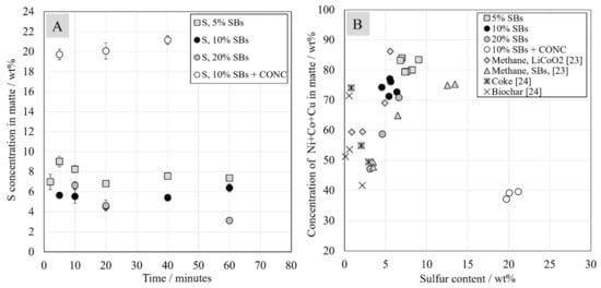 Figure 7B shows the results from this study plotted against results from other studies using coke, biochar, and methane as reductants in nickel slag cleaning process conditions. The comparison gives indicative results as the experiments were not conducted identically. In the case of biochar and coke, the exact amount of reductant is unknown [24]. In the methane experiments, the quenching technique and sample size are different [23]. Nevertheless, according to Figure 7B, in general, utilizing biochar, methane, and coke seems to yield the lowest concentration of valuable metals in matte. On the other hand, the sulfur content in matte was also lower than with spent batteries addition. It seems that, when utilizing only battery scrap as the reductant, without addition or coke or biochar, higher contents of sulfur in matte are obtained. It must be noted that only one metallic phase, denoted matte, was detected in samples reduced by coke or biochar, whereas, in this study, in addition to the matte phase, an alloy phase was formed.