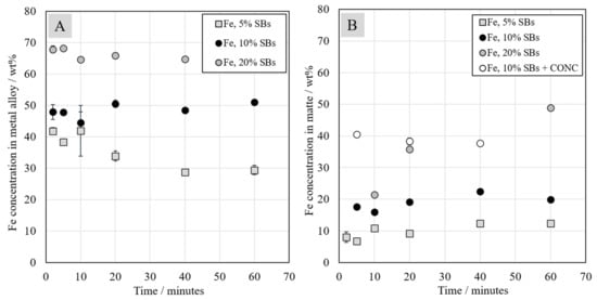 Iron concentrations in metal alloy and matte are presented in Figure 8. The iron concentration in the metal alloy formed in the system was much higher than in the matte. In the system with 5 wt.% of SBs, iron concentration in the metal alloy reached 42 wt.% and that in the matte reached around 8 wt.% after 2 min contact time. In metal alloy, the iron concentration decreased to around 30 wt.% after 60 min contact time and that in the matte increased to 12 wt.%. Iron concentration in both metal alloy and matte increased with the increasing fraction of battery scrap in the starting mixture. Consequently, it can be stated that, with the increasing amount of added battery scrap, the concentration of the reductant (graphite) increased as well, resulting in increased iron oxide reduction from the slag.
