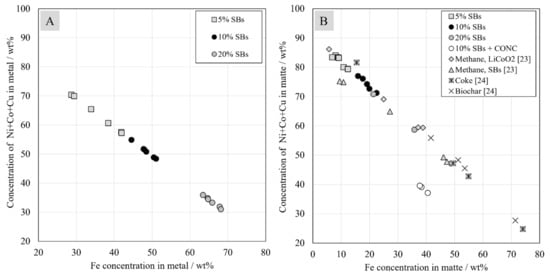 The results from the previous studies of Avarmaa and Ruismäki are also plotted in Figure 10 [23,24]. Utilizing coke as reductant seems the least feasible option in terms of concentration of valuables in matte. Long reduction time allows more iron to deport into alloy and matte. However, one data point with coke indicates similar results to those when utilizing 5 wt.% of battery scrap. Utilizing 20 wt.% of battery scrap yields quite scattered results compared to results utilizing biochar and methane. However, results from using methane were scattered as well, whereas results from 10 wt.% and 5 wt.% of battery scrap fit very well to the linear trend. In the case of using coke and biochar, it should be noted that an excess of reductant was used in the experiments and, therefore, long contact times allowed the reduction to proceed unnecessarily far, i.e., the iron concentration in matte increased significantly beyond the desired level.