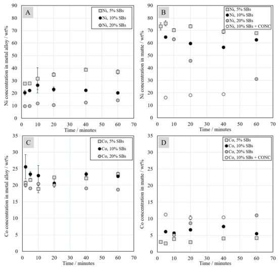 Ni and Co concentrations in slag, presented in Figure 6C,D, decreased as the reduction proceeded. The most significant change in their concentrations occurred within the first 20 min. Nickel concentration in the slag decreased with the increasing addition of battery scrap. In the system with 20 wt.% of SBs, Ni concentration in the slag was especially low, and its value decreased from 0.16 wt.% to 0.005 wt.%. This indicates extremely efficient nickel reduction when the highest amount of graphite was present in the system. The addition of Ni-concentrate decreased the concentrations of Ni and Co in the slag, indicating better recovery of these elements.