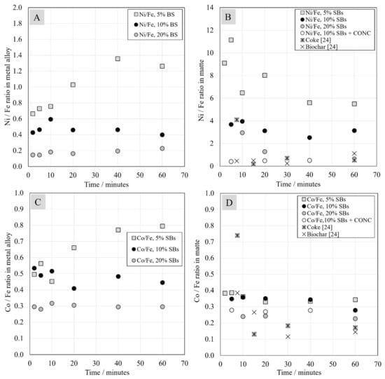 Figure 11 shows the nickel/iron and cobalt/iron ratios in the metal alloy and matte as a function of time. It is evident that an increase in the amount of battery scrap decreased the ratio of valuable metals to iron, because the concentration of iron increased. Utilizing coke and biochar as reductants yielded Ni/Fe ratios in the matte similar to 10 wt.% of SBs with nickel concentrate addition. With 5 wt.% of SBs, the Ni-, Co-, and Cu-to-Fe ratios in metal increased with increasing reduction time, whereas, with higher battery scrap amounts, the ratios seemed to remain constant or decreased slightly. In matte, the trends seemed to decrease for all valuable metals.