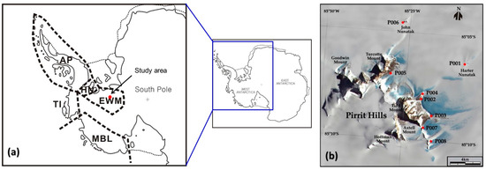 (a) Simplified location maps of the study area within West Antarctica. The major crustal blocks include the Antarctic Peninsula (AP), the Ellsworth–Whitmore Mountains (EWM), the Haag Nunataks (HN), Marie Byrd Land (MBL), and Thurston Island (TI) [30]. (b) Satellite image of the Pirrit Hills and sampling locations (modified from [25]).