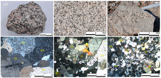 The Pirrit Hills granite outcrops are fairly uniform in appearance, consisting mostly of medium- to coarse-grained leucocratic alkali feldspar granite (Figure 2). The Pirrit Hills granite contains partly pegmatite and aplite veins. It mainly consists of quartz, K-feldspar, plagioclase, biotite, muscovite, and accessory minerals of zircon. Quartz is mostly anhedral and frequently shows undulatory extinction. K-feldspars are mainly perthite with Carlsbad twins and forms micrographic intergrowths with quartz in several samples. Plagioclases are euhedral to subhedral and show albite and locally albite-Carlsbad twinning, some of which are affected by alteration with secondary sericite. Biotites are subhedral with minor alteration to chlorite along grain boundaries and cleavages, and sometimes contain opaque minerals [25].