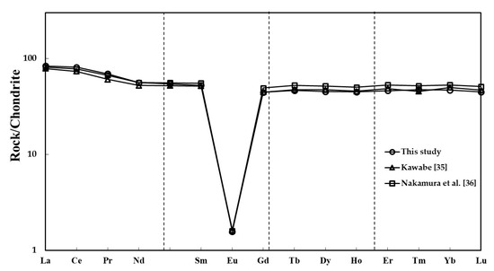Chondrite-normalized REE pattern of JG2 to compare new data from this study with published values [35,36]. Normalizing chondrite values are taken from McDonough and Sun [37].