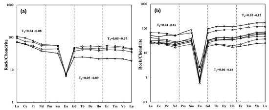 Chondrite [37]-normalized REE distributions for (a) A group; Eu/Eu* > 0.1 and (b) B group; Eu/Eu* < 0.1 among Pirrit Hills granite samples. The values of T1, T3, and T4 were calculated following equations given in Monecke et al. [7].