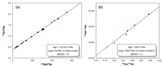 Table 3 lists the whole-rock Rb-Sr and Sm-Nd isotopic compositions for the Pirrit Hills granite samples. Samples analyzed gave 87Sr/86Sr ratios of 0.778773 to 2.060016 (2 σ SE) and 143Nd/144Nd ratios of 0.512372 to 0.512579 (2 σ SE). Additionally, then, the Rb-Sr whole rock age, including the data reported by Millar and Pankhurst [27], yield 172.8 ± 2.4 Ma (Figure 5a) with (87Sr/86Sr)i = 0.7065 ± 0.0087, which is almost the same as the of 173 ± 3 Ma by Millar and Pankhurst [27]. The whole-rock Sm-Nd data gave an isochron age of 169 ± 12 Ma with (143Nd/143Nd)i = 0.512207 ± 0.000017 (Figure 5b) and εNd(t) = −4.16.
