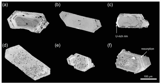 Representative BEC images of analyzed zircons by Lee et al. [25]. (a,d), (b,e), and (c,f) belong to samples P001, P002, and P006, respectively. Zircons separated from the three rock samples can be grouped type 1 (a–c) and type 2 (d–f) based on chemical composition and internal textures.