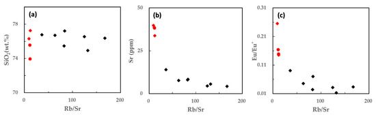 (a) SiO2, (b) Sr, and (c) Eu/Eu* vs. Rb/Sr variation diagrams; ● A group (ICP-MS data); ♦ A group (TIMS data); ♦ B group (TIMS data).