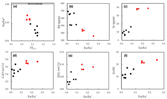 However, the relationship between twin element ratios (La/Nb and Zr/Hf) and TE1,3. (Figure 9a,b) indicates that the REE tetrad effect might be a product of a fluid-melt interaction rather than fractional crystallization. Therefore, our data seems to suggest that the Eu anomaly of the Pirrit Hills granite is likely to have occurred with the REE tetrad effect after formation of granitic magma under a magmatic-hydrothermal transition system.
