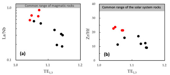 (a) La/Nb and (b) Zr/Hf vs. tetrad effects. Gray bands refer only to elemental ratios and not to TE1,3 values [4]; ● A group; ● B group.