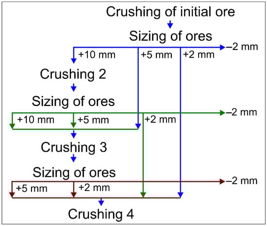 The disintegration scheme is shown in Figure 1: the power supply of the crusher and its unloading were subjected to a sieve analysis on sieves with square holes of 10 mm, 5 mm, 3.5 mm, and 2 mm. After each operation, the final product of crushing of the size class −2 + 0 mm was removed from the process. The mass of each sample of the initial ore was reduced by quartering to obtain a mass equal to or close to the mass of the magnetic separation product.