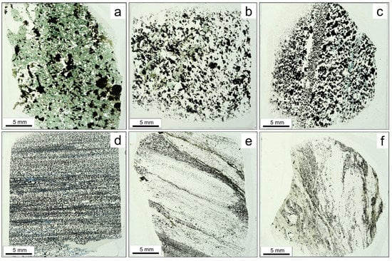 The rocks of the magnetic product are mainly represented by ferruginous quartzites: medium- to fine-grained, uneven-grained, weakly banded, massive textures. The following varieties are distinguished: containing one or two types of amphiboles and micaceous ferruginous quartzites. The content of silicates and quartz varies in the range of 20% to 60% (Figure 2). The scale shown in the upper-left corner of the first thin section applies to all others. Ore minerals are represented by magnetite, hematite, and sulfides. The size of the magnetite impregnation is from the first microns up to 1 mm (Figure 3).