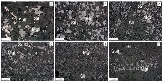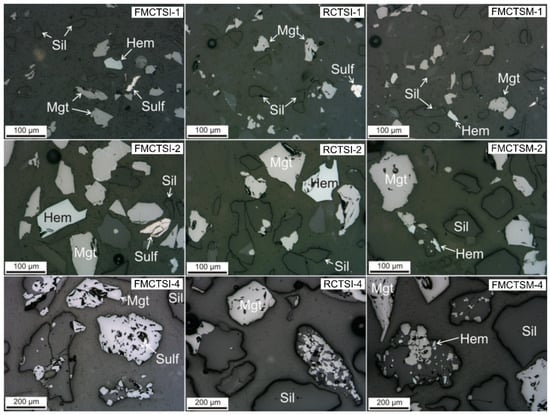 In the aggregates, magnetite is found with hematite (Hem), sulfides (Sulf), and silicates (Sil). Two types of magnetite aggregates with silicates are distinguished: 1—an aggregate composed of relatively large magnetite and silicates, where hematite and sulfides may be present; 2—a thin impregnation of magnetite in silicate, where hematite may also be present, and less often sulfides. In the initial ore, the magnetite aggregates with silicates are represented by the second type.