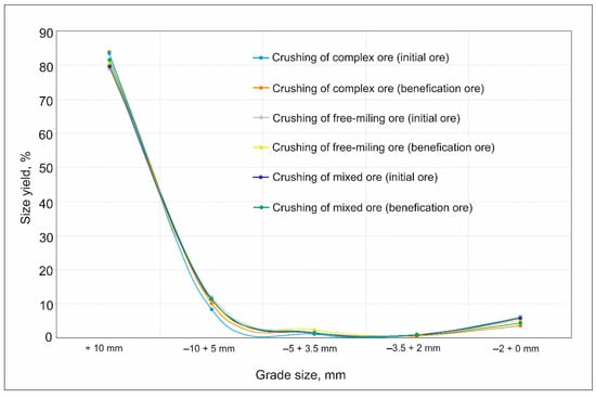 The granulometric composition of crushing products of the initial and processed ore of the intermediate disintegration stages and the final (more than 94% of the size class −2 + 0 mm), namely the yield of size classes, in most cases coincide; the variations are minimal and do not exceed 2% absolute (Figure 4, Table 8).
