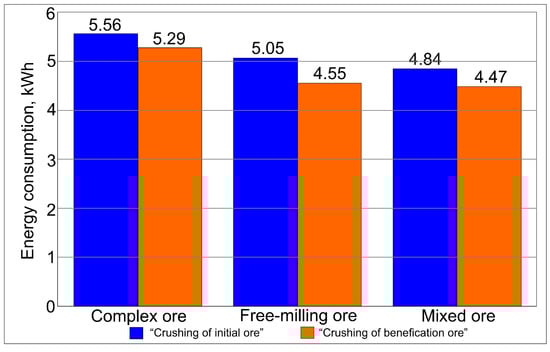 Figure 5 shows a histogram of the energy consumed when bringing the samples’ ore mass to a particle size of less than 2 mm. A decrease in the energy consumption for crushing the magnetic separation product in relation to the crushing of the source ore material has been found: