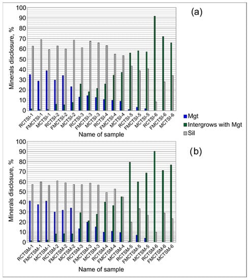 It was found that in the magnetic separation product of the ore sample from the Kostomuksha deposit, the amount of liberated magnetite in the size class −1 + 0 mm increases by 12.1% compared to the initial ore sample. For the sample of the Korpangskoe deposit, the opposite trend is observed: a decrease in the amount of free magnetite by 30.9% in the magnetic product. Analysis of the magnetite liberation in the mixture indicates a deterioration in the results obtained during the separate crushing of refractory and free-milling ore and a decrease in the amount of open magnetite in the magnetic product by 60% compared to the initial ore.