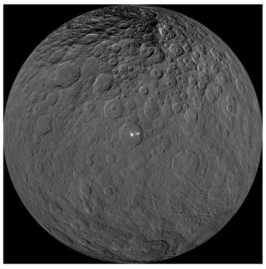 - Russell, C.T.; Raymond, C.A.; Ammannito, E.; Buczkowski, D.L.; De Sanctis, M.C.; Hiesinger, H.; Jaumann, R.; Konopliv, A.S.; McSween, H.Y.; Nathues, A.; et al. Dawn arrives at Ceres: Exploration of a small, volatile-rich world. Science 2016, 353, 1008–1010. [Google Scholar] [CrossRef] [Green Version]