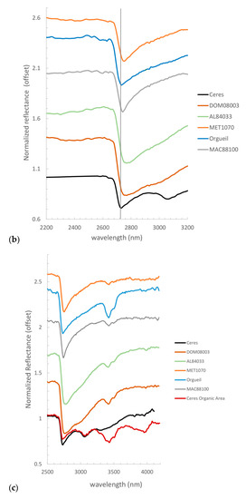 Ceres does not have an asteroidal family [28] and has not been directly sampled. Thus, we do not have meteorites from Ceres. Nevertheless, carbonaceous chondrite (CC) meteorites, especially CM and CI groups, have been considered the closest analogs for Ceres (e.g., [29,30,31]). Laboratory spectra of CM and CI carbonaceous chondrites measured under anhydrous conditions [31,32] show the same prominent 2.7 µm OH absorption band as the Ceres average spectrum, typical of Mg-phyllosilicates (Figure 2). This characteristic is similar to those of highly altered CM [33] and CI chondrites [34]. Also, the measurements of other CC under an asteroidal environment (high vacuum and temperature) show similarities with the Ceres spectrum (Figure 2) [31]. However, the spectra of these chondrites are not a perfect match with Ceres at other wavelengths and, even if the average spectrum of Ceres is broadly similar to that of CM chondrites, specific spectral bands indicate variations in the mineral mixture composing the surface. The most remarkable difference is that CM and CI chondrites lack Ceres’ features at 3.05–3.1 µm (Figure 2b), attributed to the presence of NH4 in the phyllosilicates [23,35], as demonstrated by spectral measurements on ammoniated-phyllosilicates in laboratory [27,36,37,38]. Ammoniated clays have not been identified in carbonaceous chondrites, but NH3 is a component of organics in CM/CI chondrites [39].