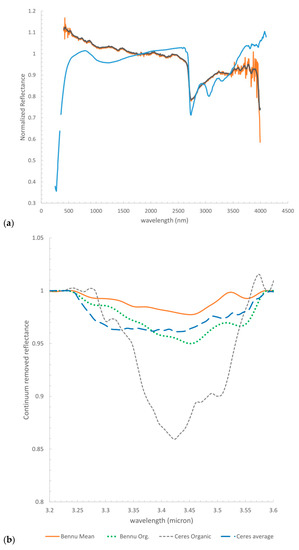 (a) Comparison between the average spectrum of Ceres (blue) and Bennu (not smoothed data in orange; smoothed data in grey). The spectra have been normalized at 2000 nm. Bennu spectra are from [55], Ceres spectrum from [24]. (b) Comparison between Ceres (blue-average spectrum, gray organic-rich average spectrum) and Bennu (average in orange; organic-rich in green). The spectra have been removed by the continuum in the range 3.25–3.6 µm. Bennu spectra are from [52,55]. Ceres spectra from [15,24].