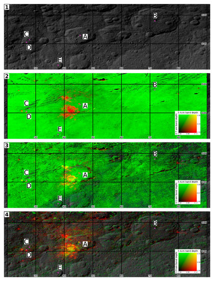 Interaction between the 3.4 µm band (organics) with other mineral phases identified on Ceres (i.e., phyllosilicates (2.7 µm band), ammoniated phases (3.06 µm band), carbonates (3.9 µm band)) in the Ernutet region. 1: clear filter mosaic; 2: abundances of organics in red and phyllosilicates in green; 3: abundances of organics in red and ammoniated phases in green; 4: abundances of organics in red and carbonates in green. Ranges are 0.20–0.26 for 2.7 µm band depth, 0.06–0.08 for 3.1 µm band depth, 0.04–0.12 for 3.4 µm band depth, 0.06–0.10 for 3.9 µm band depth. Morphological features in the figure are: A: Ernutet crater, B: Omonga crater, C: Hakumyi crater, D: Sukkot Labes, E: Liber crater.