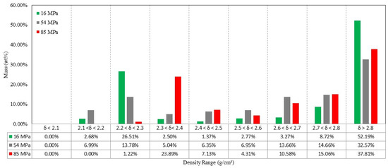 The coarse aggregate particles in densities over 2.8 g/cm3 represent 57.92% of the total mass in this concrete (16 MPa) and 24.62% in the density fraction 2.7 to 2.8 g/cm3. This suggests that if a density separator, such as water or an air jig [7,26], is used to recover coarse, liberated aggregate denser than 2.7 g/cm³, then a mass recovery higher than 80% of coarse aggregate could be achieved for the concrete 16 MPa. At the same conditions of separation, the coarse aggregates recovery for the concretes of 54 MPa and 85 MPa would be 61.50% and 73.02% in mass, respectively.