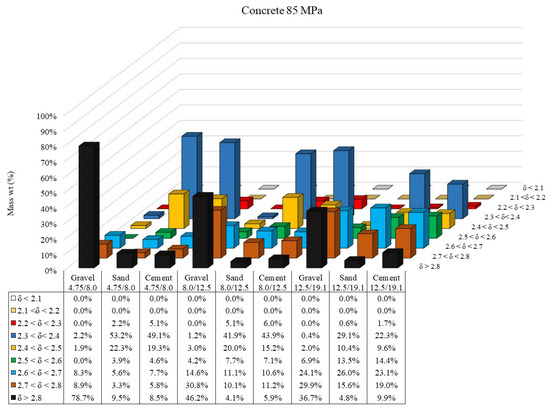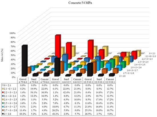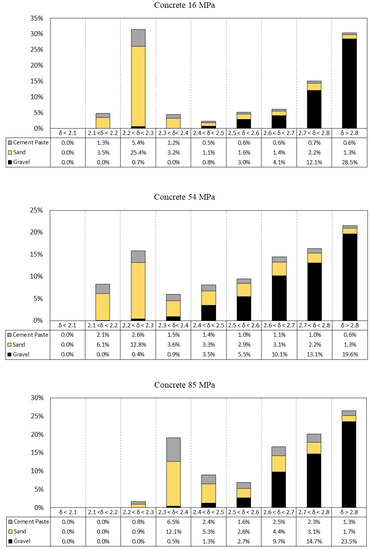 Figure 6 and Figure 7 present the density distribution of coarse aggregate, sand, and cement paste particles in different size ranges for concretes 54 MPa and 85 MPa.